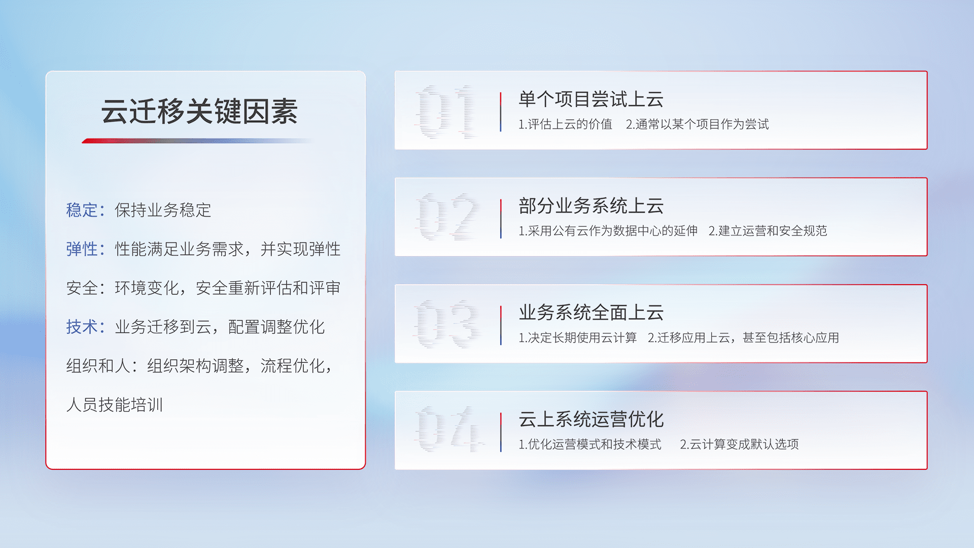 结合实际业务,,,从规划设计、、、、云平台选型、、云原生改造、、、数据迁移、、集成交付,,,迁移全过程为客户识别最佳上云路径,,做好风险识别管理,,,设计网络架构、、、身份权限、、、安全审计合规、、操作审计、、、日志审计、、、、监控告警策略、、、、多站点容灾设计等,,,,对云上基础设施进行整体规划,,提升IT治理水平,,,以满足弹性、、、高可用、、、、高性能的需求。。