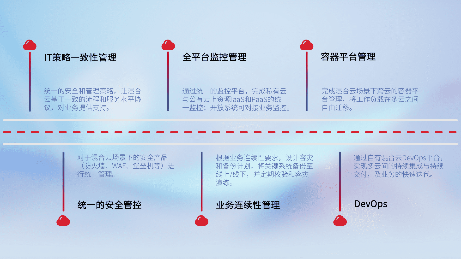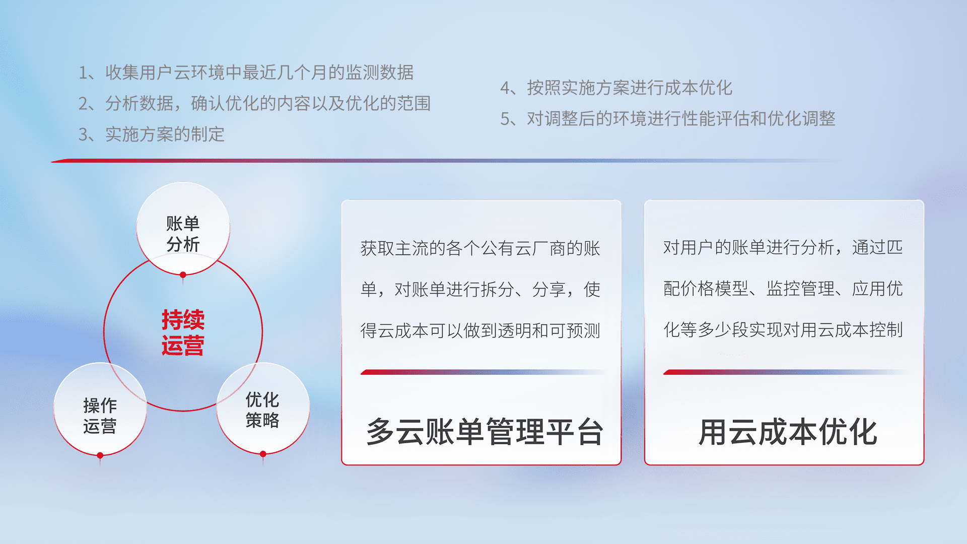 通过多云纳管,,,,以统一的资源数据模型把客户的云资源进行抽象和封装,,进而实现对多云资源的统一操作,,保障云资源管理的可靠性、、、稳定性与可用性。。。量身定制化运维内容,,,配置、、、、开发运维、、补丁管理、、、、备份、、、、监控、、认证和访问管理、、、审计和日常巡检等,,保障在用云过程中的可靠度,,,,稳定度以及高可用率。。。。