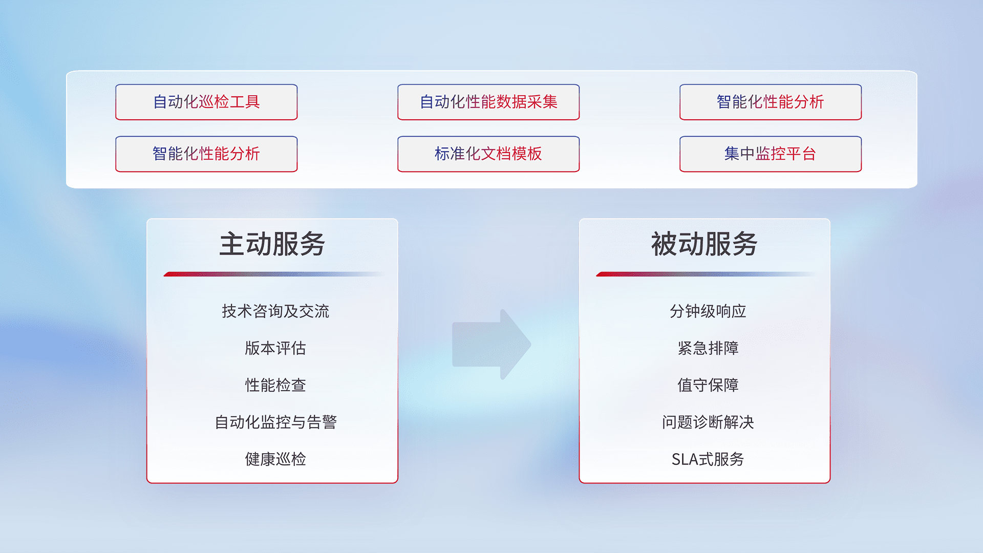 智能化工具和标准化文档,,,保障服务质量,,,提供主动服务(包含技术咨询、、、版本评估、、、、性能检查、、、自动化监控与告警、、健康巡检)和被动服务包含(分钟级响应、、紧急排障、、值守保障、、、问题诊断解决、、、、SLA服务)。。。