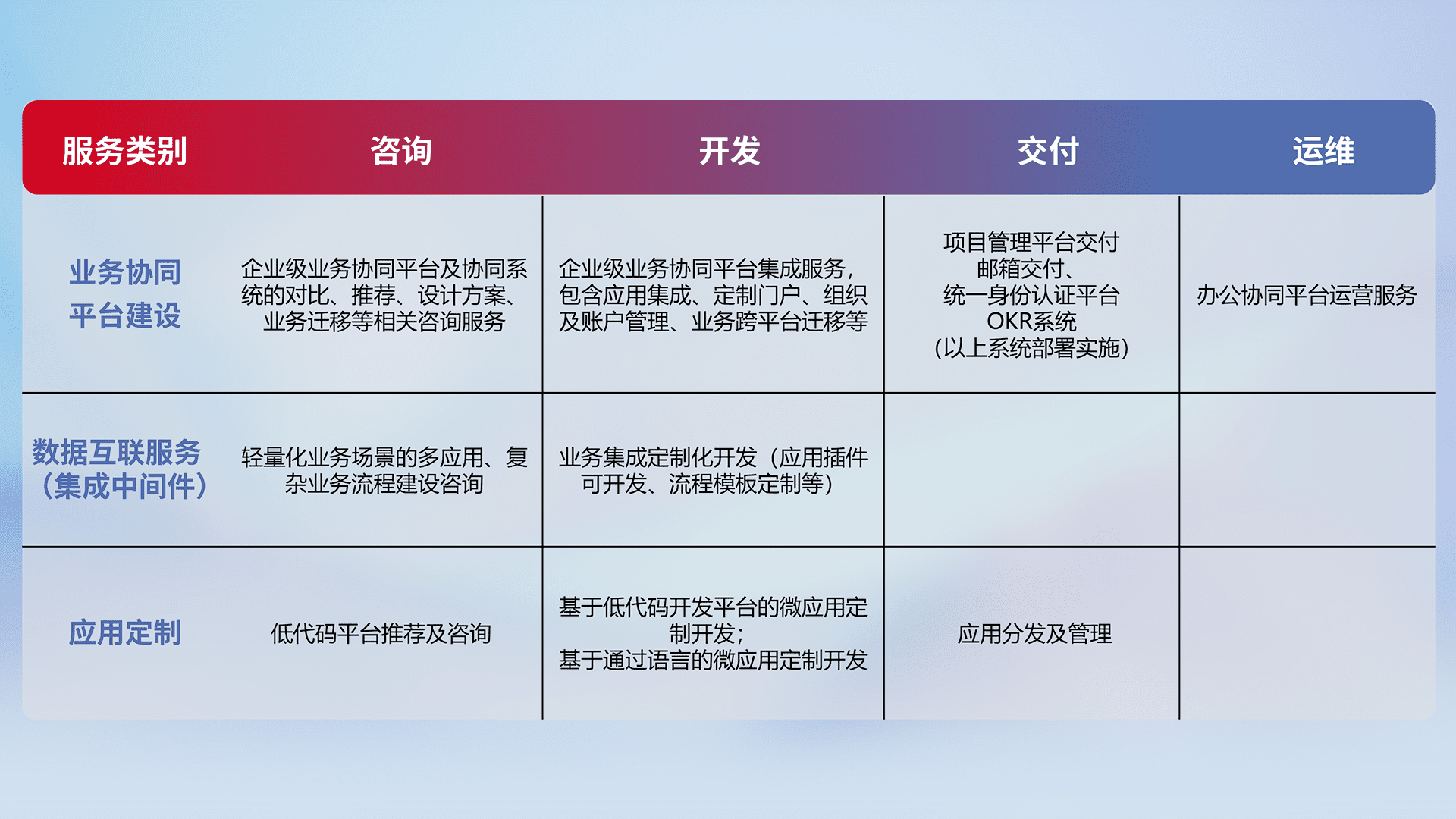 针对钉钉、、、、企微、、、IDaas等平台级产品提供产品的规划、、方案、、交付、、、、定制化开发等服务,,,,实现如统一协同办公、、、智能客户服务、、混合会议管理、、、、智能数据查询、、、等业务场景,,,实现数字化转型。。。